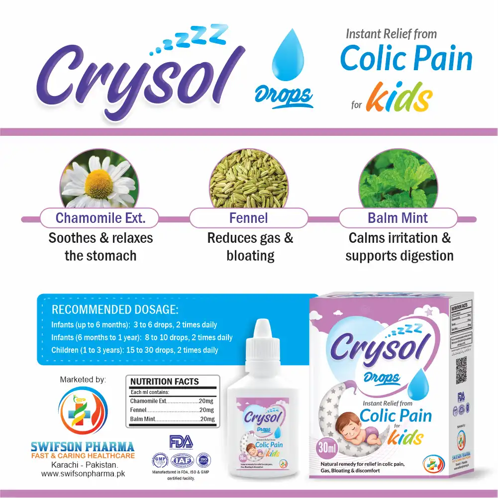 Crysol Colic Drops are specially formulated for infants and kids to provide fast relief from gas, bloating, stomach cramps, and colic-related crying. The herbal combination of Chamomile, Fennel, and Balm Mint helps relax the baby’s stomach, support healthy digestion, and soothe irritability naturally.