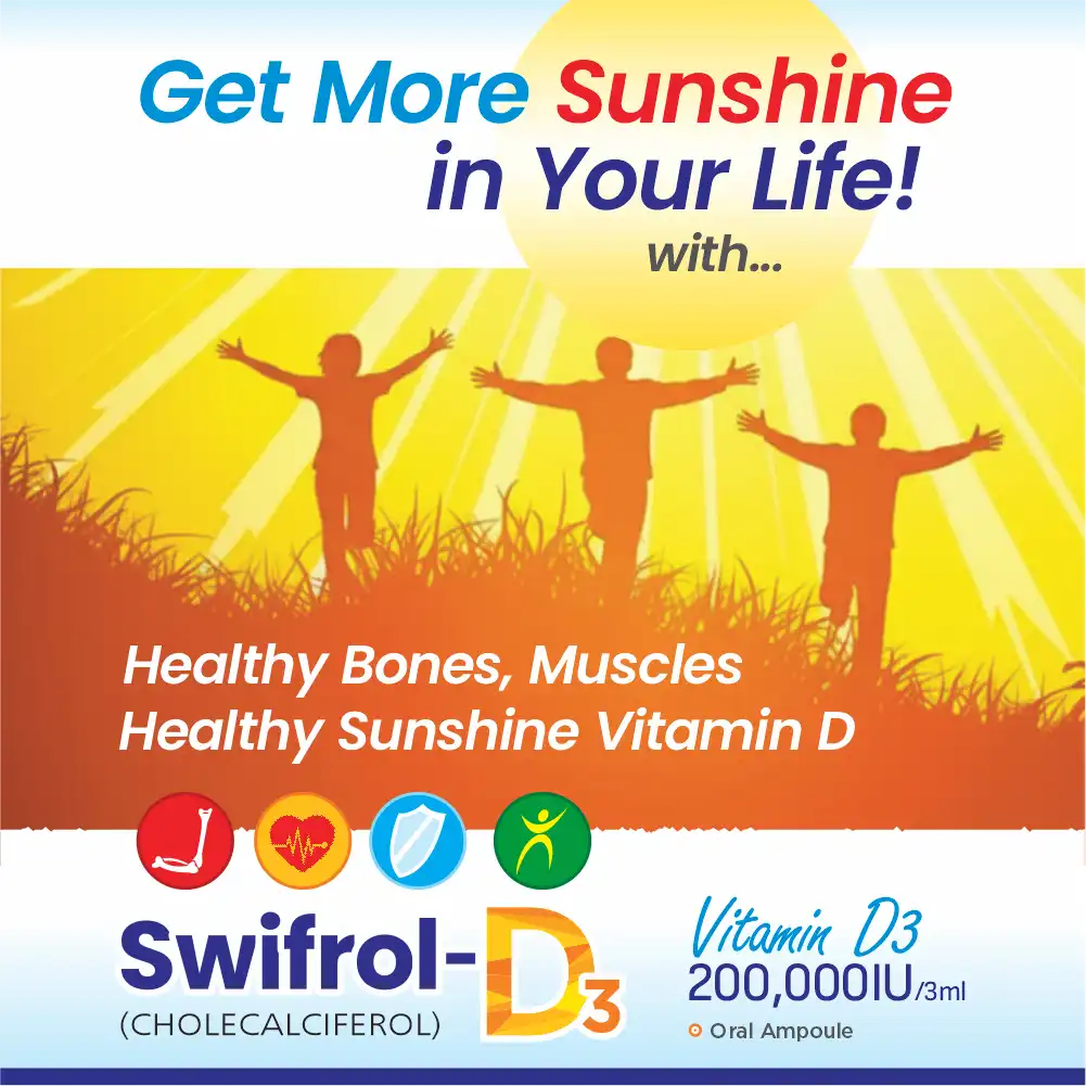 Swifrol-D3 Oral Ampule (Drinkable Vitamin D3 Shot) delivers a high-potency dose of 200,000 IU Cholecalciferol in a safe, easy-to-use liquid form. This powerful Vitamin D3 shot rapidly restores low Vitamin D levels, improves bone health, and boosts immunity.
